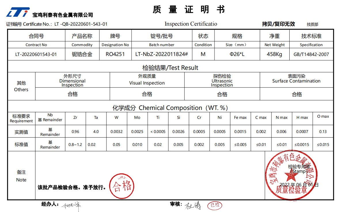鈮鋯合金執(zhí)行標(biāo)準(zhǔn):GB/T14842-2007 、YS/T656-2015